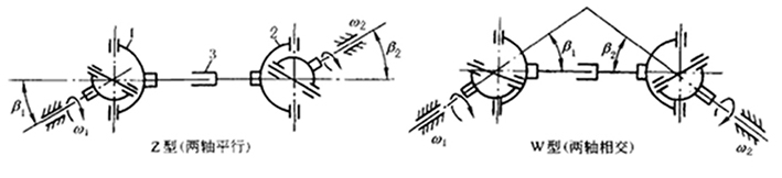 萬向聯軸器的安裝形式按其軸線相互位置,一般分Z(兩軸平行)W(兩軸相交),見下圖。